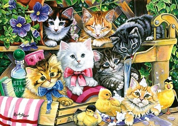 Parta kočiček na puzzle Kočičí Koupel se sešla na oslavě. Vidíme, jak jednu z nich potkalo nedobrovolné koupání, a to spolu s kuřátky a kachňátky, kterým ovšem voda vůbec nevadí. Úsměvný obrázek si určitě s nadšením složí všichni milovníci chlupatých mňoukajících zvířátek, kteří dobře vědí, jaká stresující záležitost je pro kočky koupel. Napovídá to i vyděšený výraz kočky, na kterou teče voda.